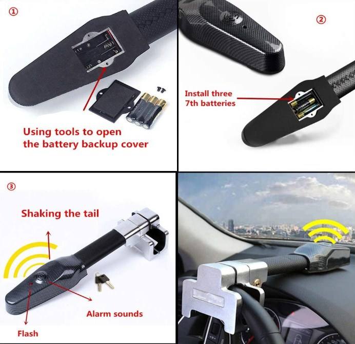 শক এবং মুভমেন্ট সেন্সর সহ শক্তিশালী 120 dB সাউন্ড অ্যালার্ম সহ কার স্টিয়ারিং হুইল অ্যালার্ম লক। প্লেসমেন্টের পরে 8 সেকেন্ডের বিলম্বের সাথে অ্যালার্ম সিস্টেম, সেইসাথে আন্দোলন সনাক্ত করার সময়। অ্যালার্মটি বাজতে শুরু করতে 8 সেকেন্ড সময় নেয়, এটি সংযোগ বিচ্ছিন্ন করতে এবং অসাবধানতার ক্ষেত্রে অস্বস্তি এড়াতে সক্ষম হতে। প্রয়োজন 3 AAA ব্যাটারি অন্তর্ভুক্ত নয়।